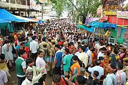 The Ambubachi Mela (/ˈæmbuˌbɑːtʃi, ˌæmbuˈbɑːtʃi ˈmeɪlə, miːlə/) is an annual Hindu mela (gathering) held at Kamakhya Temple in Guwahati, Assam.[4] This yearly mela is celebrated during the monsoon season that happens to fall during the Assamese month Ahaar, around the middle of June when the sun transits to the zodiac of Mithuna, when the Brahmaputra River is in spate. During this time Brahmaputra River near the temple turns Red for three days.[5][6][7]
