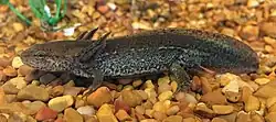 Mole salamanders are stocky, with short bodies and large heads. They can range from 4.5 to 10.9 cm (1.8 to 4.3 in) in length.[2] Their weight can range from 3.5 to 10.5 g.[2] They are normally gray or dark brown in color, with darker mottling and lighter gray undersides. Males can be distinguished by the presence of a swollen cloaca. Larvae and paedomorphic adults are aquatic and have large feathery gills. A. talpoideum can be distinguished from other salamander larvae by the presence of two light stripes on their underside[3]