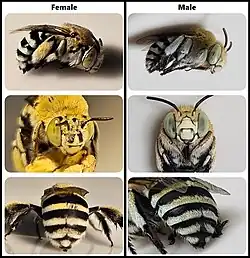 The thoracic hair is mostly ginger or brown on top and white underneath.[1] The metasoma has white hair bands with metallic blue-green iridescence, but in about 10% of specimens the bands are orange.[1] Females have a large spot of pale hair on the end of the abdomen, with a hairless black triangle just above it.[1] Males have notches of black hair on the end of the abdomen.[1]
