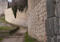 Amelia is especially known for its almost intact, defensive Pre-Roman walls, built by Italic civilizations (Umbrians and Pelasgians) in the centuries between the 6th and 4th BC. The oldest of these are located inside the historic center between the Teatro Sociale and the Porta della Valle. Large segments of these were constructed using polygonal masonry of a type defined as "cyclopean", meaning they are characterized by limestone blocks of considerable size (sometimes exceeding 2 metres), cut with great precision in the shape of irregular polygons and then stacked without using mortar.[5][6]