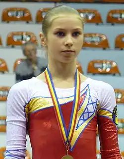 Racea started gymnastics at the age of 6 and won her first all around national title in her age category in 2007. In 2008, she joined the junior national team in Deva.[1] She had a successful junior career, medaling at various international competitions. She won silver on beam and bronze on floor and placed fourth all around and with the team at the 2008 Junior European Championships.[3] In 2009, she placed fifth all around at the prestigious American Cup ahead of more experienced gymnasts such as Koko Tsurumi and Kristina Goryunova.[4] If not for a fall from uneven bars she might have placed higher.[1] Later that year she won the all around junior title at both the City of Jesolo Trophy in Italy and the Lugano Trophy in Switzerland.[5][6] The 10th European Youth Olympic Festival in Tampere was a very successful meet for Racea. Here she won a total of six medals, two gold (vault and beam) and four silver (floor, uneven bars, all around and with the team).[7]