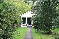 The front portion of the house dates to 1871, and was built in Greek Revival style to mimic the older Oakleigh House. The three-bay façade has the front door with transom and sidelights in the rightmost bay, and unique triple-hung sash windows in the other two. The porch is recessed under a pedimented gable resting on boxed columns. The balustrade, with its shallow tail cut joints was likely transferred from the 1830s garçonnière. The gable of the original house is partially visible from the front.