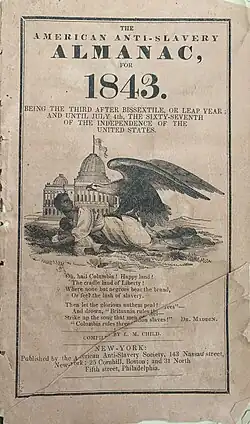 The American Anti-Slavery Almanac was an abolitionist publication published yearly from 1836 to 1843 by the American Anti-Slavery Society, as one of the society's efforts to raise awareness of the realities of slavery in nineteenth-century America.[1] The yearly almanac compiled calendars and astronomical data with anti-slavery literature, art, and advertisements[2] in a small, neat pamphlet. The 1843 edition included works from authors such as William Lloyd Garrison and Thomas Moore, as well as accounts of recent slave rebellions and quotes from political speeches supporting the abolition of slavery.[3] The almanac did not call for uprising or violence, but rather served as a means to spread the word about the anti-slavery cause.[4][5][6][7][8]