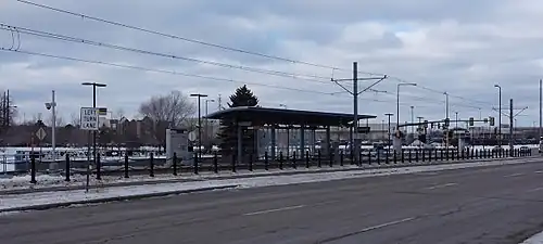 American Boulevard is a light rail station in Bloomington, Minnesota at the intersection of 34th Avenue South and American Boulevard, just south of Interstate 494. It is the only station on the Blue Line to have a split design where the northbound platform is on the opposite end of the intersection from the southbound platform. It is an infill station, that was built after the rest of the line had been completed. It was included in the original plans for the Blue Line, but was shelved when extra costs incurred caused plans for the Mall of America station to change. The station had a dedication ceremony for construction workers on December 9, 2009 and opened on December 12, 2009.