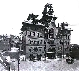Built in 1887 by John Frederick Wiessner, a German immigrant, for his Weissner Brewing Company, the Northeast Baltimore brewery was one of the largest breweries in the state of Maryland. At its peak, the brewery employed 61 workers: 16 in brewery work, 17 drivers, 14 in the bottling house, 8 garage men, and 6 office workers.[2] The central tower of the building housed a 10,000-bushel grain elevator.[3] Prohibition forced the shutdown of the facility in 1920. In 1931 the Wiessner family sold the brewery to the American Malt Company,[4] which modernized the interior equipment and operated the brewery until 1973. The building was listed that year in the National Registry of Historic Sites.