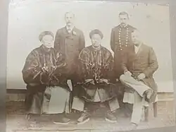 The members of the Cheng Tu Commission, associated with the American China Development Co. From left to right:Secretary of the U.S. Legation in Peking, F.D. Cheshire, Lieutenant Merrill, and U.S. Consul, S. P. Read. Unknown Chinese man, and Sheng Xuanhuai.