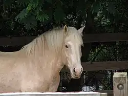 The champagne gene produces diluted color, and the gold champagne body color, light skin, light eyes, and ivory mane and tail associated with the American Cream Draft are produced by the action of the champagne gene on a chestnut base coat.[6][7] In the adult horse, the skin is pink with abundant dark freckles or mottling,[8] and the eyes are hazel or amber. The eyes of champagne foals are blue at birth, darkening as they age, and a foal's skin is bright pink.[9] The breed registry describes foals' eyes as "almost white",[2] which is consistent with the nature of the champagne blue foal eye, which is creamier than other types of blue eye.[10]