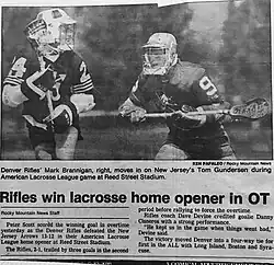 - The Denver Rifles were one of the 6 original members of the American Lacrosse League. They were the only team west of the Mississippi river and not located in a traditional lacrosse hotbed market. The team is credited by multiple local Colorado lacrosse players and coaches along with the Vail Lacrosse shootout for jump starting the growth of lacrosse in the Rocky Mountains to where it is now a vibrant lacrosse community. Peter Scott, an All-American attackman, from Johns Hopkins University was the first player inked to a contract by the club's General Manager John Bock. Local coaching legend, Jon Barocas (a Hall of Fame High school coach from East High school in Denver who is in the Coaches Hall of fame) served as the team's assistant General manager. Barocas was credited with garnering multiple marketing opportunities for the team and its players. The legendary player Dave Devine (from Cornell University and a member of the USA World Lacrosse team) served as the team's Head Coach. The team practiced during the pre-season in the famed City Park of Denver causing many patrons to wonder what men with sticks were doing running around with the ducks and the geese. The Rifles would eventually lead the league in attendance during the regular season due to the efforts of Bock and Barocas. The team colors were Red with white and blue trim. The Jerseys were red with royal blue shorts.
