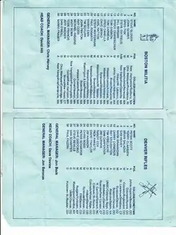 The ALL announced a 10-game cable TV package deal with the FNN/MSG (Madison Square Garden network), which reached at the time over 32 million television homes.[8] As it turned out, no drug testing was ever performed on players or included in any of the player contracts. In addition, the concept of a "family atmosphere" was also a fiction as Denver Rifles co-Captain, Steve Bevelle, overheard the League owners instructing the referees in confidence prior to the first game in Boston to "put away the whistles and let the men play." The clear inference was to let the games indeed turn into the WWE but with sticks and helmets. [[ thumb ]]