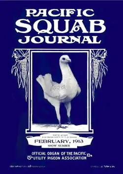 It hailed from the west coast – originally Southern California. At that time, it was called the "Pacific Squab Journal" (PSJ), and was first published in 1913. It was not, however, the first magazine devoted to pigeons in America. Even "The Fancier" was not first.[3] It was already in publication in 1886, but even others preceded it.[4]"The Fancier", however, had ceased publication before the PSJ began. The "Pigeon News"[5] also started before the APJ, starting in 1895 but ceased publication around 1967 while the APJ continued until 1994, a total of 81 continuous years. While the first issue was devoted mainly to squabbing utility breeds in California, it opened the door to a wider audience, including fancy pigeons along the Pacific coast. In addition to the magazine, they also published books relating to the hobby and business, including "American Squab Culture",[6] and Profitable Pigeon Breeding by Arthur Hazard[7] Although many issues are now over 100 years old, many can be found in Wiki commons and on the web include Abe books[8]