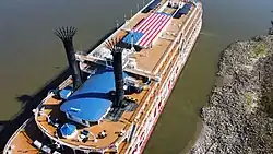 American Queen was a Louisiana-built river steamship said to be the largest river steamboat ever built.[3] American Queen's primary mode of propulsion is its stern paddlewheel powered by a steam engine extracted from the 1932 dredging vessel Kennedy.[4] Her secondary propulsion, which provides additional maneuverability and speed, comes from a set of diesel-electric propellers known as Z-drives on either side of the sternwheel. There are also two bow thrusters that offer better maneuverability when docking or treading water.[5] She has 222 state rooms for a capacity of 436 guests and a crew of 160. She is 418 feet (127 m) long and 89 feet (27 m) wide.[6]