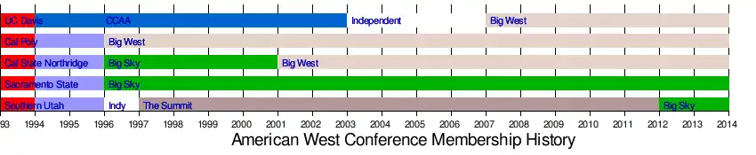 The American West Conference (AWC) was a college athletic conference in the United States from 1993 to 1996. It consisted of schools in California and Utah. The charter members of the conference were California Polytechnic State University; California State University, Northridge; California State University, Sacramento; the University of California, Davis; and Southern Utah University.