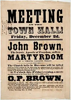 John Brown has been called "the most controversial of all 19th-century Americans".[84] When Brown was hanged after his attempt to start a slave rebellion in 1859, church bells rang across the North, there was a 100-gun salute in Albany, New York, large memorial meetings took place throughout the North, and famous writers such as Ralph Waldo Emerson and Henry David Thoreau joined other Northerners in praising Brown.[85] Whereas Garrison was a pacifist, Brown believed violence was unfortunately necessary to end slavery.