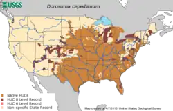 - ^ P. Fuller; M.E. Neilson; K. Hopper (30 August 2023) [Peer reviewed on 12 April 2013]. "Dorosoma cepedianum (Lesueur, 1818)". Nonindigenous Aquatic Species Database. Gainesville, Florida: U.S. Geological Survey. Retrieved 15 October 2023.