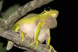 To attract mates, the male American green tree frog uses a distinctive advertisement call which is noticeably different from its release or warning calls. This is important for reproductive isolation in areas where different species share breeding areas.[27] Once a mate has been attracted, the pair begins amplexus in which the male frog grasps onto the female to initiate fertilization. The species is polygynous, with the male generally seeking to mate with as many females as it can attract.[5] Eggs are attached to substrates such as emergent vegetation, and unlike other frog species, these egg masses are typically laid in permanent bodies of water rather than vernal pools.[28]
