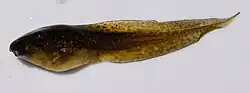 Tadpoles are green with a yellow or white stripe extending from each nostril to the eye and may have mottled tail fins.[25] American green tree frogs show only the parental investment of mating and egg-laying.[5]