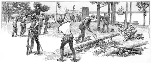 A palisade is a series of vertical pales (stakes) driven or set into the ground to form a fence or barrier. Palisade construction is a palisade or the similar use of timbers set on a sill; an example in England being the original portion of the ancient Greensted Church and the early type of stave church known as a palisade church. It was common for Native Americans and Europeans to build a palisade as part of a fort or to protect a village. Palisade construction is alluded to as a method of building of early dwellings.[11] The nature of planting one end of a timber in the ground is called earthfast or post in ground construction which was a common way to build worldwide. A benefit of earthfast construction is the ground holds the posts from swaying which eliminates the need for bracing and anchors the structure to the ground. The French settlers called this carpentry en pieux or poteaux en terre[12] and log on end.[13] This type of carpentry may not considered framing. The French method of poteaux en terre was different than palisade construction in that the timbers were hewn two sides and spaced slightly apart with the gaps filled with a material called bousillage[12]