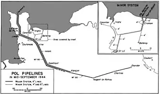 By the end of August, one Major System MT80 pipeline had reached Alençon, another was at Domfront, and an avgas pipeline had nearly reached Domfront, but breaks in the line forced truck units to draw MT80 from Saint-Lô. Up to this point the pipeline had overriding priority, but its construction required the railway system to deliver 500 to 1,500 long tons (510 to 1,520 t) of pipes, tanks, pumps and fittings each day. By mid-September, the pipeline's priority was downgraded, and pipeline construction units had to rely on motor transport instead of rail transport, limiting progress to 7 to 8 miles (11 to 13 km) per day. The pipeline reached Coubert on 6 October, and there it remained until January 1945.[52][53]