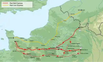 The solution adopted was the Red Ball Express, a term appropriated from the railways. The plan called for a one-way highway loop running around the clock. This expedient had never been attempted before and the procedures for operating it were untried. Routes were marked with Red Ball markers. Red Ball convoys commenced on 25 August, and reached their peak on 29 August when 132 companies with 5,958 vehicles delivered 12,342 long tons (12,540 t) of supplies. They moved at a maximum speed of 25 miles per hour (40 km/h) with 60 yards (55 m) between each vehicle and no overtaking was permitted. An hourly ten-minute break was taken at ten minutes before the hour. Opposition from the Luftwaffe was absent, permitting the use of lights at night. In practice, convoy discipline, especially with regard to speed limits, was not always followed. Without adequate numbers of military police to control the routes, it proved impossible to reserve them for the exclusive use of the Red Ball Express. Congestion resulted when the routes were also used by the First and Third Armies and the Ninth Air Force, with military and civilian vehicles sometimes attempting to move against the flow of Red Ball traffic. The deadline was not met, but by 5 September 89,000 long tons (90,000 t) had been delivered to the Dreux-Chartres area.[70]