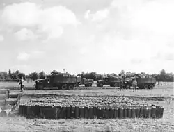 Motor transport was used as a stopgap, but there was a shortage of suitable vehicles owing to political interference and production difficulties.[67] The tardy delivery of vehicles adversely affected the training of motor transport unit personnel, and the US Army's racial segregation complicated matters. The cost of inadequate training of truck drivers was paid in avoidable damage to vehicles through accidents and poor maintenance.[69] The pursuit resulted in large quantities of equipment being damaged, worn out, and written off. In November, SHAEF reported to the War Department that each month, 700 mortars, 375 medium and 125 light tanks, 900 2+1⁄2-ton trucks, 1,500 jeeps, and 100 artillery pieces had been written off. Tank losses in August and September respectively had been 25.3 percent and 16.5 percent of establishment, and the reserves were exhausted. Over 15,000 vehicles were deadlined, awaiting repairs or parts.[103]