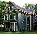 The city was founded in 1864 as a station stop on the Cedar Rapids and Missouri Railroad and was named after 19th century U.S. Congressman Oakes Ames of Massachusetts, who was influential in the building of the transcontinental railroad.[9] Ames was founded by local resident Cynthia Olive Duff (née Kellogg) and railroad magnate John Insley Blair,[10] near a location that was deemed favorable for a railroad crossing of the Skunk River and Ioway Creek. William West (1821–1919) became the first mayor of Ames in 1870. With his wife Harriet, from 1869 to 1892, he ran Ames's first hotel, known as West House, on Douglas Avenue on the site of the present Octagon Center for the Arts. West was a highly respected pioneer businessman who also served on the Ames School Board in the 1880s when Central School was built on the site of the present Ames City Hall on Clark Avenue and Sixth Street. The Wests raised several daughters and sons. William West spent the last of his life living with his son in northwest Iowa.[11]