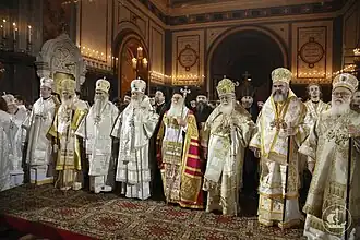Gathering of global Orthodox clergy: Amfilohije (in white, fourth from left), Patriarch Bartholomew I of Constantinople (in white and red, centre).