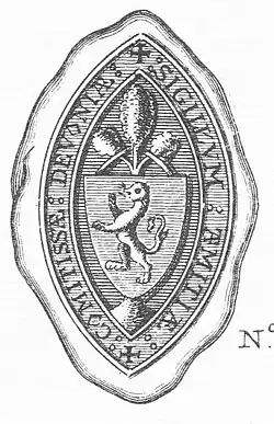 ![]() Seal of Amice de Clare. The shield depicts the arms of her husband Baldwin de Redvers, "a lion rampant". The device above the shield is likely to be a heraldic device of de Clare, part of her paternal armourials. Legend: "SIGILLUM AMITIAE COMITISSAE DEVONIAE" (seal of amicia, Countess of Devon) | |