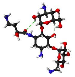 Amikacin evades attacks by all antibiotic-inactivating enzymes that are responsible for antibiotic resistance in bacteria, except for aminoacetyltransferase and nucleotidyltransferase.[27] This is accomplished by the L-hydroxyaminobuteroyl amide (L-HABA) moiety attached to N-1 (compare to kanamycin, which simply has a hydrogen), which blocks the access and decreases the affinity of aminoglycoside-inactivating enzymes.[27][28][29] Amikacin ends up with only one site where these enzymes can attack, while gentamicin and tobramycin have six.[15]