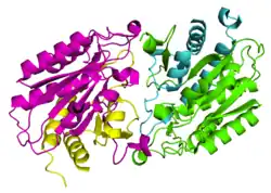 - ^ a b c d e Lindner HA, Lunin VV, Alary A, Hecker R, Cygler M, Ménard R (November 2003). "Essential roles of zinc ligation and enzyme dimerization for catalysis in the aminoacylase-1/M20 family". The Journal of Biological Chemistry. 278 (45): 44496–504. doi:10.1074/jbc.M304233200. PMID 12933810.
