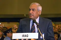 ![]() Al-Sadi at a press conference on the practical arrangements for the return of UN weapons inspectors to Iraq (1 October 2002) | |