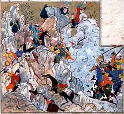 In 1370 Timur decided to attack Amir Husayn at Balkh. After crossing the Amu Darya at Termez his army surrounded the city.[4] Husayn's army came out of the city to attack Timur's men, perhaps suggesting that they were unhappy to find themselves being besieged. The same occurred on the second day of the battle, but this time Timur's men managed to get into the city. Husayn shut himself up inside the citadel, leaving Timur's men to sack the city.[5] After capturing the city, Timur executed Khabul Shah, the Husayn's puppet Khan of Western Chagatai and installed Suurgatmish on the throne of Khan as his puppet. This made Timur the main power in Mawarannahr and Western Chagatai Khanate with supremacy over Central Asia.[4]