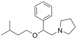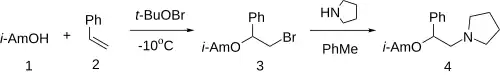 The treatment of isoamyl alcohol (1) with styrene (2) at -10 °C with dropwise addition of tert-butyl hypobromite gives (2-bromo-1-(isopentyloxy)ethyl)benzene (3).[3][4] Displacement of the halogen leaving group by pyrrolidine completes the synthesis of amixetrine (4).