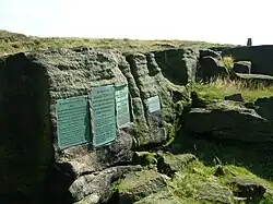 He is commemorated by a bronze statue in Uppermill by Manchester sculptor James Collins, commissioned as part of the 1991 Saddleworth Festival for the Arts .[7] The bronze was cast by "Benin Bronze" art foundry in Wigan, 1989-90. The foundry no longer operates. There are also commemorative plaques on the rocks of Millstone Edge, Standedge, where his ashes were scattered. The Pennine Way National Trail passes this spot, which is near a trig point at an elevation of 1470 ft (448m).[8] Alfred Wainwright in his 1968 Pennine Way Companion describes Ammon Wrigley as a "much-revered writer and poet whose love of the country around his native Saddleworth shone in all his works" and mentions an annual commemorative ceremony at the memorial stone; he includes a sketch of "The Ammon Wrigley Memorial Stone" showing the plaques.[9]