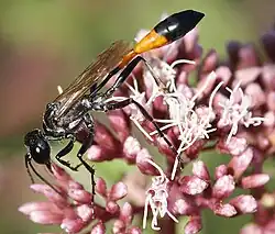 | Ammophila sabulosa taking nectar on a hemp agrimony flower head | |