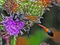 Ammophila sabulosa is a large (15–25 mm or 0.59–0.98 in long) and striking solitary hunting wasp with a very long narrow "waist" of two segments. The body is black except for the front half of the "tail", which is orange.[7]