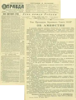The Amnesty of 1953 (Russian: Амнистия 1953 года) was the largest amnesty in the history of the Soviet Union (and in the history of Russia) in terms of the number of the released persons. It was declared by the March 27, 1953 Decree of the Supreme Soviet of the Soviet Union on the Amnesty.[1][2] Since it was signed by Kliment Voroshilov, it was initially known as the Voroshilov's amnesty.[1] Later it has become known as Beria's amnesty, because it was initiated by March 26, 1953 Lavrenty Beria's draft.[3] Between 1.2 million [4] and 1.35 million[5] persons were freed.