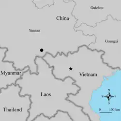 The species is known from the following two localities: Muong La District in Son La Province, Vietnam, and Lvchun County in southern Yunnan Province, China.[1][2]