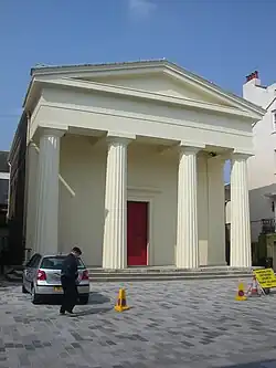 Brighton Unitarian Church, a Grade II*-listed building,[24] was built early in Wilds junior's architectural career. He designed the 350-capacity building with guidance from its first minister, Dr Morell.[25] It was intended to resemble the Temple of Thesæus in Athens,[12][25] and has an enormous tetrastyle portico of four Doric columns beneath a pediment.[26]