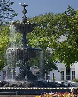 Wilds Junior's last work in Brighton[19] was the Victoria Fountain in Old Steine. Partly paid for by public donations, it was unveiled on 24 May 1846—Queen Victoria's 27th birthday—and is now a Grade II listed structure. It consists of two cast-iron or bronze[49] basins, one of which stands on three dolphins, and a pool, and is 32 feet (9.8 m) high. The iron casting was done at a local foundry,[19][50][51] and the sculpting was undertaken by a Mr Pepper. The structure cost £989.16s.7d., and a further £114.7s.6d. was spent constructing it.[52]