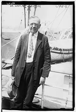 Butler founded several organizations, including the Brookville Society of Natural History in 1881, the Indiana Academy of Science in 1885,[4] and the International Committee on Mental Hygiene[5] He was also a member of several other organizations, including the American Ornithologists' Union, Wilson Ornithological Club, the Biological Society of Washington, the Cincinnati Society of Natural History, and the Nature Study Club of Indiana.[6] From 1897 to 1923, Butler was the Secretary of the Indiana Board of State Charities where he began researching prison reform and mental disabilities.[5][7] During his career, he would serve as the president of the National Conference of Social Work and the American Prison Congress, and he would be appointed the U.S. delegate to the International Prison Congress three times.[8] He retired in 1930 and began researching the native peoples of Indiana which include research on silver trading at Fort Ouiatenon.[8]