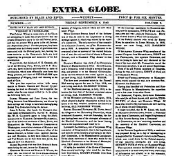 Suffering from extreme poor health,[60] he resigned as Postmaster General effective May 18, 1840.[61] John Quincy Adams, a bitter foe of both Jackson and Van Buren, confided to his diary in December 1840 that he believed both men had been "for twelve years the tool of Amos Kendall, the ruling mind of their dominion."[62] Kendall wrote extensively for the Washington Extra Globe newspaper in the summer and fall of 1840 in an unsuccessful effort to boost Van Buren's chances for re-election.[36]