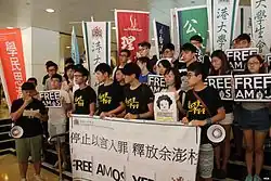Yee's sentence led to protests from several activist groups. On 27 June 2015, about 60 people from more than 10 civil society groups under the banner of the Taiwan Association for Human Rights demonstrated outside the Singapore Trade Office in Taipei. The protesters held placards and chanted "Free Amos Yee" for about half an hour.[126] On 30 June, university students in Hong Kong held a protest to urge the Singaporean government to release Yee. Student activist group Scholarism, which took part in the protest, published a post asserting that the actions taken against Yee reflected the lack of freedom of speech within Singaporean society.[127][128][129]