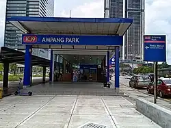 Ampang Park LRT station is a light rapid transit (LRT) station in Kuala Lumpur that is served by RapidKL's LRT Kelana Jaya Line. The LRT station is the last underground station on the Kelana Jaya Line along Jalan Ampang, near the Jalan Tun Razak intersection, before the line heads above ground again at Damai LRT station.