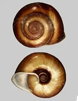 (Original description in Latin) The solid shell is well umbilicated, depressed-conical and somewhat shiny, with unequal striations and a brownish-black color. The spire is depressed-conical and regular, with a very obtuse, denuded, grayish apex and a distinct suture. Five moderately increasing whorls are present, the first rather flat, the others becoming convex. The body whorl barely descends, is obtusely angled, less convex below, and tightly rounded towards the open umbilicus. A broad, yellow band encircles the middle. The oblique (45° to the axis) aperture is obtusely triangular and violaceous-gray within. The whitish peristome is shortly expanded and reflexed, its strongly converging margins joined by a thin, translucent lamina. The upper margin is curvedly produced, the basal margin nearly straight, and both ascend abruptly at the insertion, not encroaching on the umbilicus.[2]