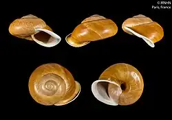 (Original description in Latin) This widely umbilicated, orbicular-convex shell is quite solid, with faint growth striae and a finely granular texture visible under magnification. Uniformly colored, it is either purplish-black or dark beige. The slightly elevated spire consists of five whorls, separated by a distinct suture. The body whorl is flattened near the suture, then convex with a slight spiral depression. The clearly flattened base also exhibits a slight spiral depression. A funnel-shaped structure surrounds the umbilicus. The final half-whorl descends, with the descent intensifying near the large, oblique, oval aperture. The white peristome is widely reflected. The middle of the columellar edge has a slight bulge on its inner margin. [2][3]