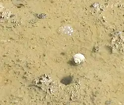 Amphibola crenata (tītiko in the Māori language or mud-flat snail in English) is a species of air-breathing snail with an operculum, a pulmonate gastropod mollusc which lives in a habitat that is intermediate between the land and the sea, not entirely terrestrial and not entirely marine.[2] This is not a true land snail, but it is also not a true sea snail. Unlike almost all other snails that have opercula, this species breathes air. It is common in New Zealand.[3]