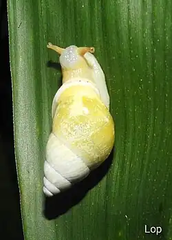 The sinistral shell is umbilicate, ovate-conic, polished, and finely striated, with the initial whorl weakly punctate. It is greenish-yellow below the periphery, fading to pale yellow above and on the spire, with the early whorls and apex whitish. The shell comprises 5.5 slightly convex whorls, the body whorl being weakly convex above and very convex, full, and saccate below. The aperture is ovate, oblique, and slightly brown or ochre-tinted within. The peristome is white and reflexed. The columella has a slightly convex inner edge, is broadly dilated, and guttered at its junction with the shell body. The dilated edge overhangs a rather large umbilicus and is slightly thickened as it extends onto the parietal wall. The parietal callus is thin and translucent.[2]