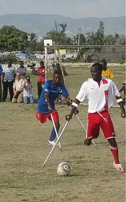 Amputee football is a disabled sport played with seven players on each team (six outfield players and one goalkeeper). Outfield players have lower extremity amputations, and goalkeepers have an upper extremity amputation. Outfield players use loftstrand (forearm) crutches, and play without their prostheses.