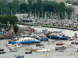 Furthermore, there are five ferry lines for pedestrians and bicycles operated by the Gemeentelijk Vervoerbedrijf (GVB) to cross the IJ. They are operational 24 hours a day. They depart every two minutes for the Centraal station–Buiksloterweg connection (two boats at a time for this short distance) to every half hour for the Centraal station–NDSM-werf connection (one boat at a time for this long distance), with Centraal Station directly accessible due to its waterside location on the other side of the IJ.