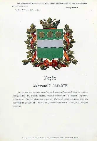 The Amur Oblast with the center in Blagoveshchensk was formed on December 20, 1858 by the Personal Decree No. 33862.[1] By this Decree, on the proposal of the Governor–General of Eastern Siberia and the Siberian Committee, the Amur Region was made up of lands "located on the left bank of the Amur River, starting from the junction of the Shilka and Argun Rivers or the borders of the Trans–Baikal and Yakutsk Oblasts, along the entire course of the Amur, to the mouth of the river Ussuri and to the new border of the Primorsky Oblast".[2]